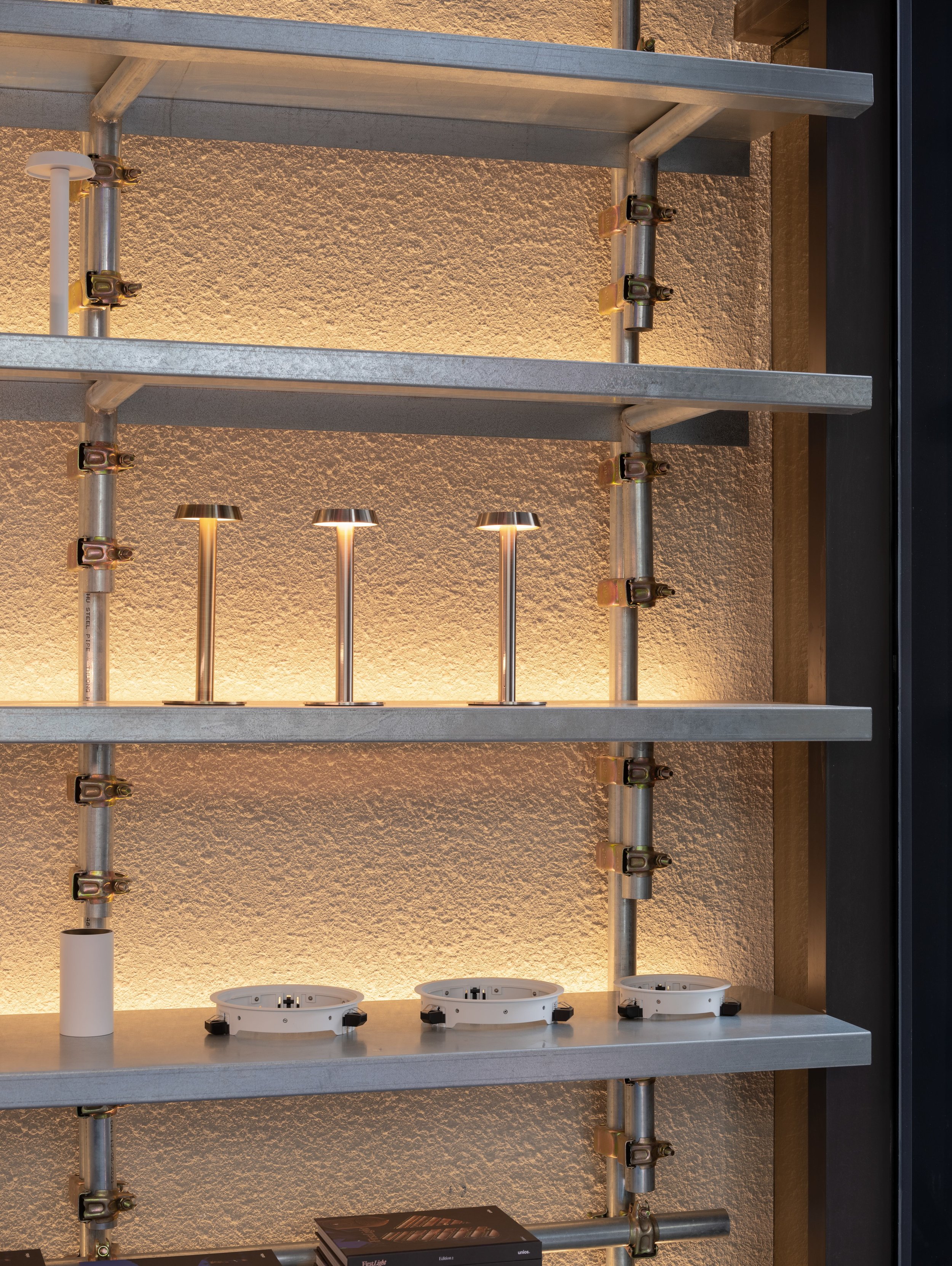 Our approach, which we call "poetic Modernism," focuses on creating experiences that infuse our interiors with delight and wonder. We also implemented stunning lighting solutions that illuminate the area and foster a warm, inviting atmosphere. Additionally, our furniture, crafted from recycled paper and plastics, highlights our commitment to sustainability. The shiny blue floor reflects the corporate color and contrasts beautifully with the warm textured walls, making the 'Unios' showroom a truly special place.